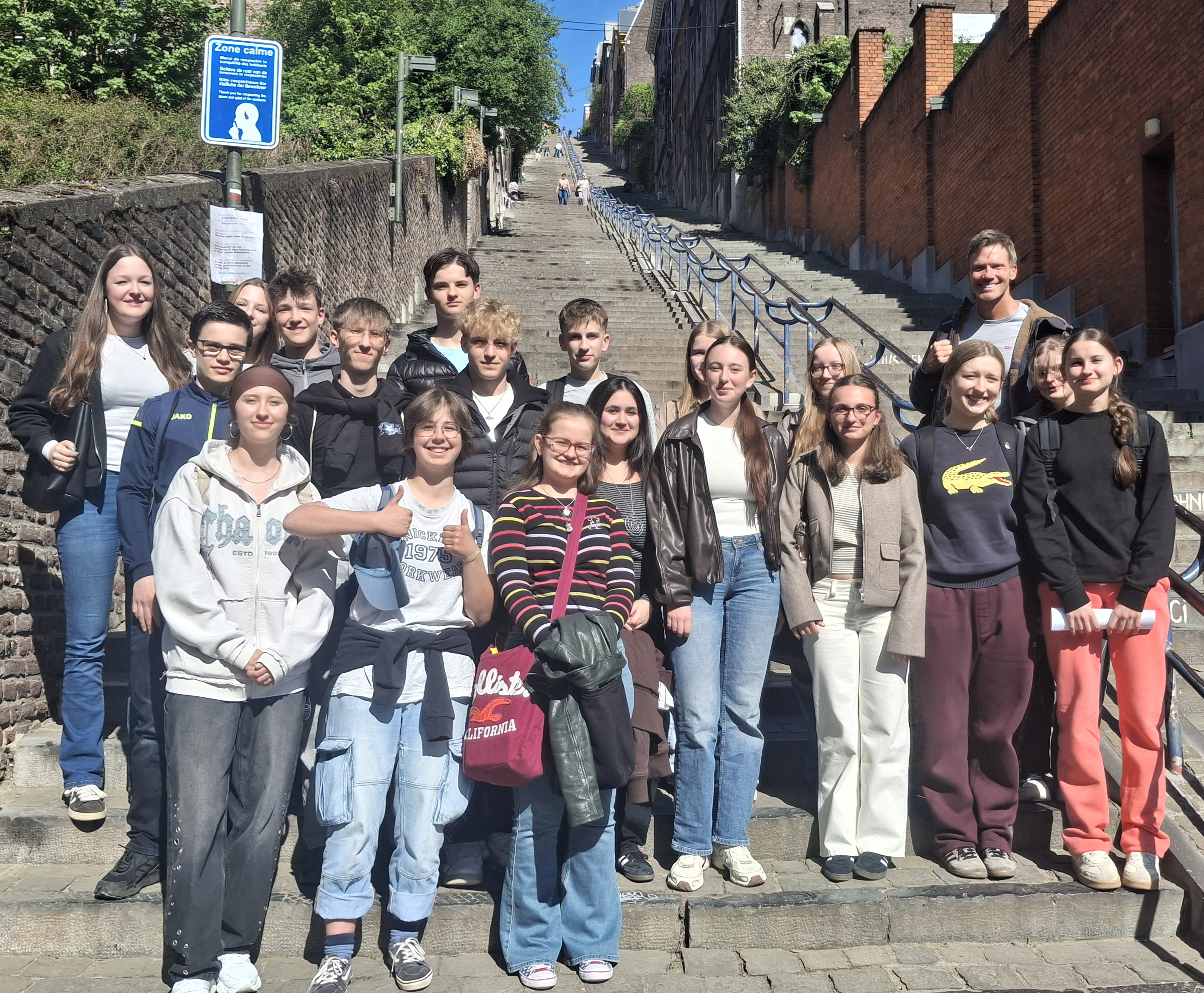Ensuite, nous sommes allés tous ensemble à la Montagne de Bueren. Là, nous avons pris une photo de tout le cours de français. Ensuite, nos professeurs nous ont donné les rallyes de la ville que nous devions faire. Nous nous sommes divisés en groupes de 3 ou 4 personnes.