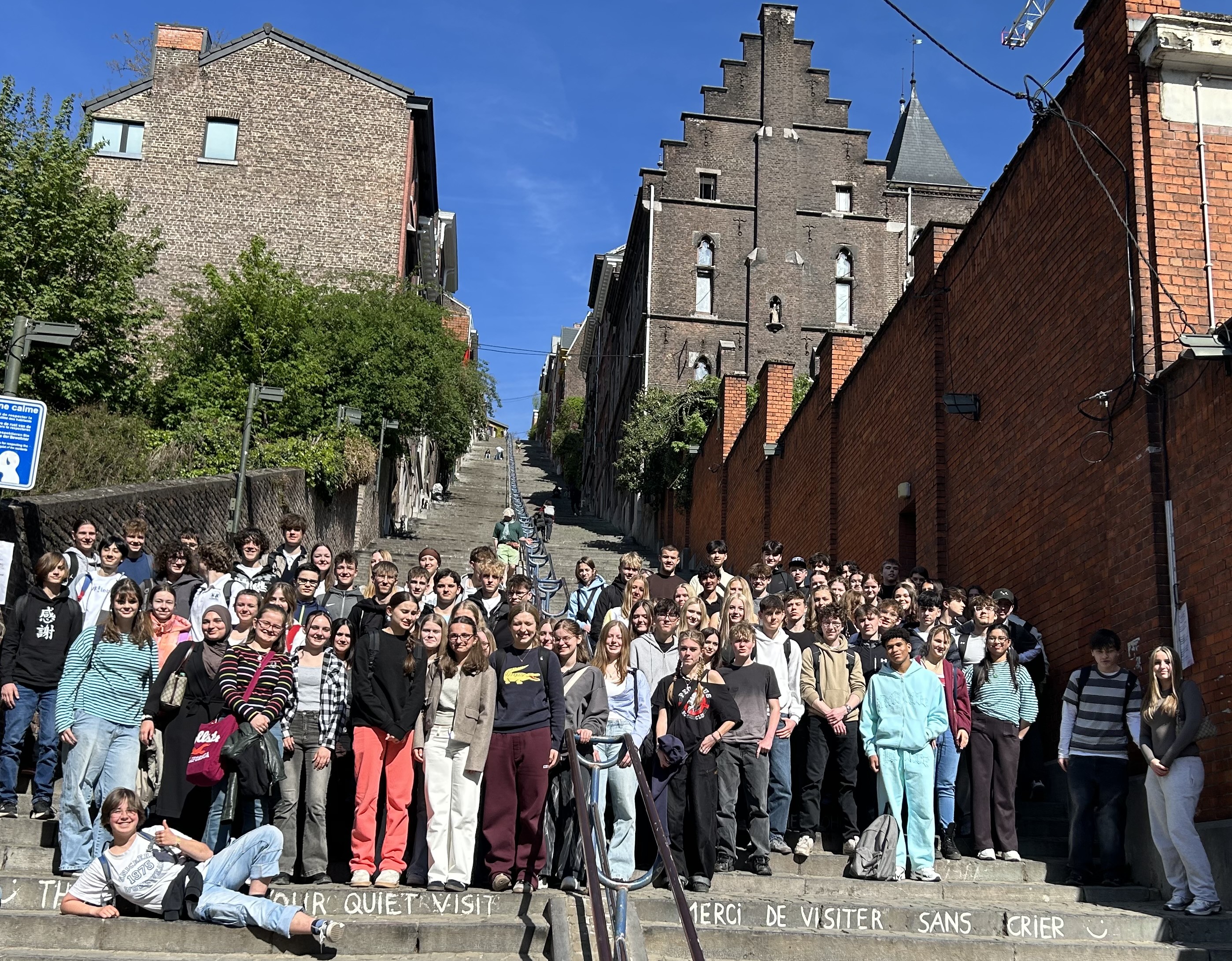 L’autre groupe est arrivé et nous avons retrouvé nos copains. Après, le groupe a monté des escaliers très grands, la Montagne de Bueren. C’est un escalier de 374 marches. Alors, nous avons quitté les autres avec nos copains et nous avons fait un rallye à travers le centre-ville.